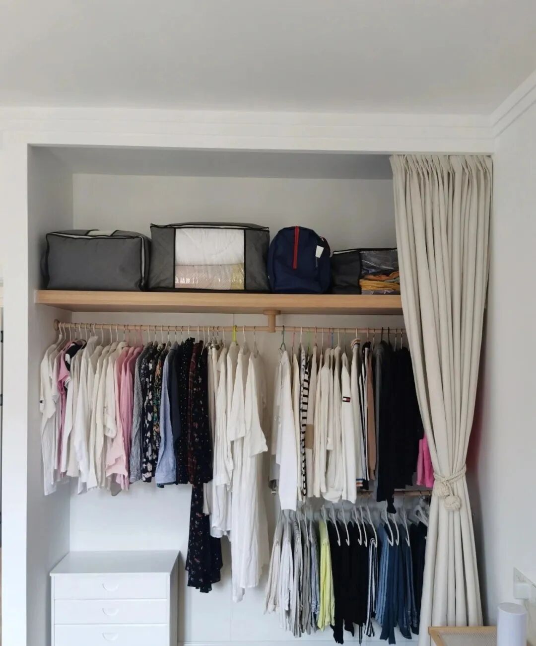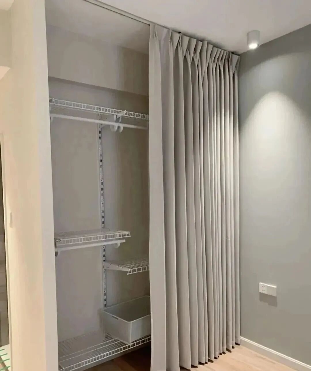砌墙衣柜如果想省点钱,装帘子是一个不错的选择,顶部加装一条轨道,开合很方便。