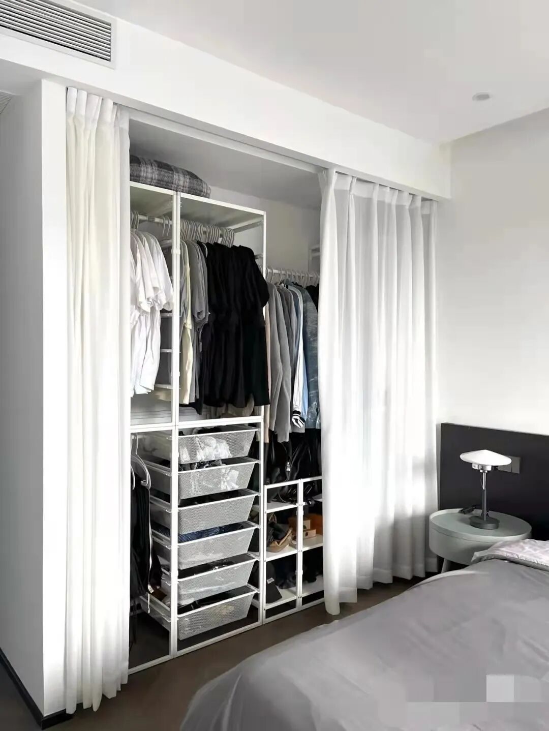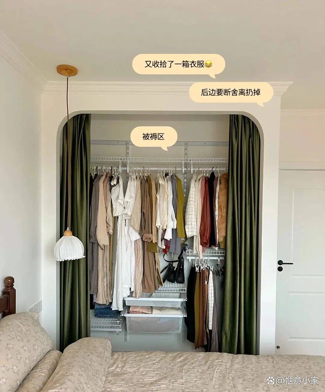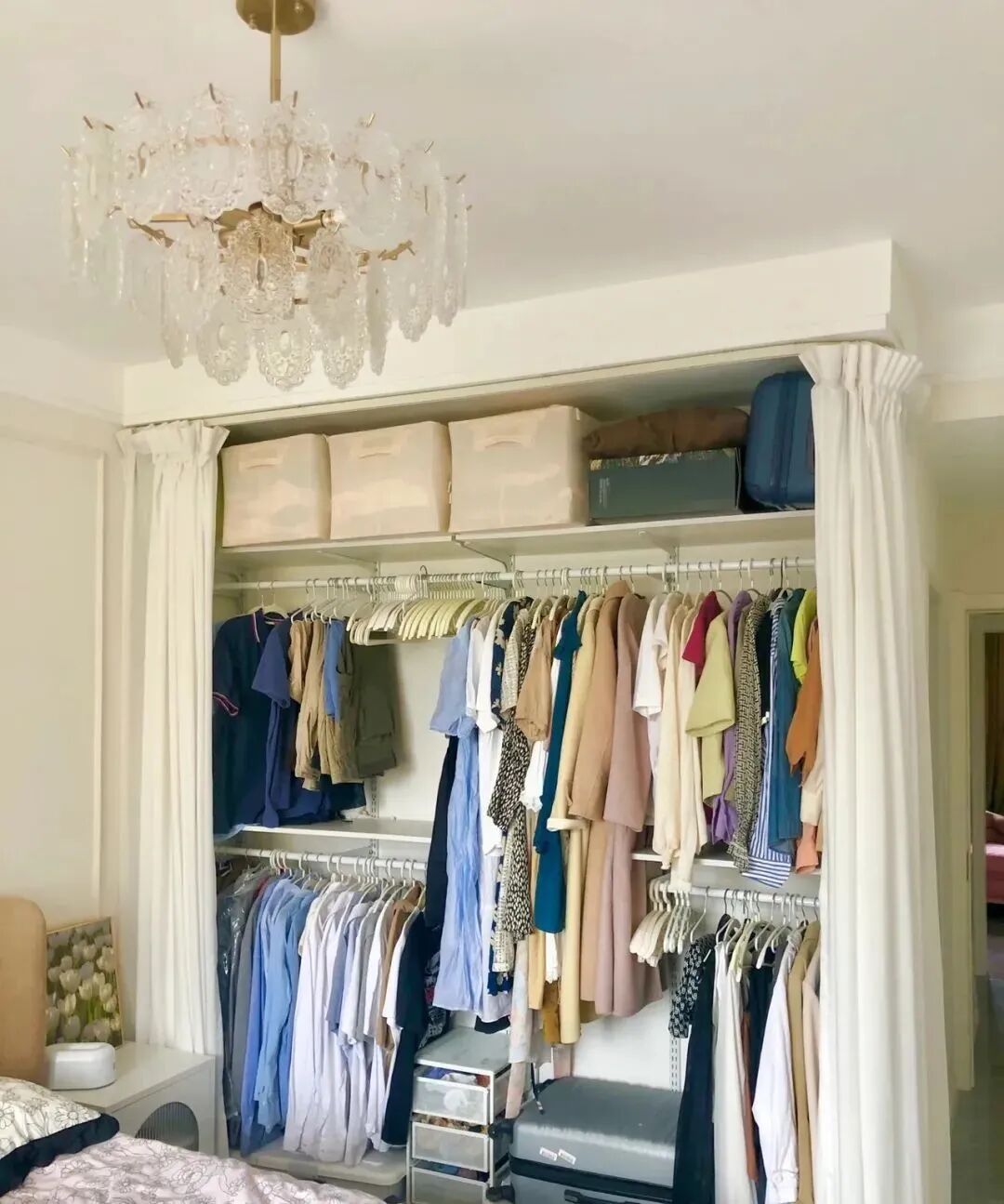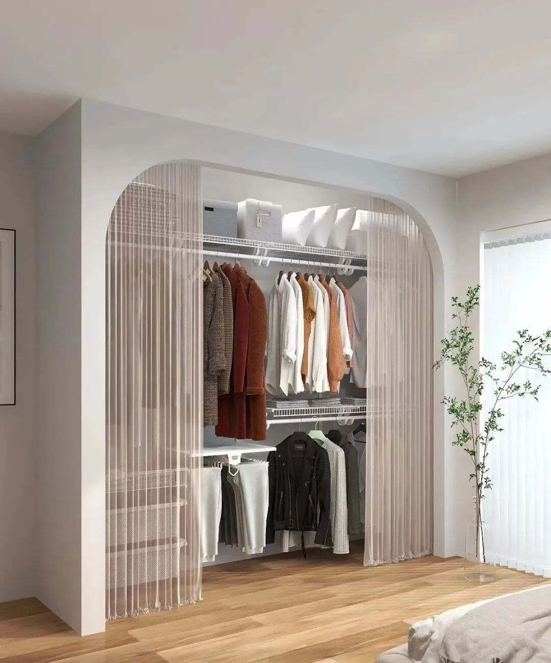 金属框架的挂帘柜子灵活性真的很强,可以根据季节或者你喜欢的风格随意切换风格,帘子一换,内部格局一更换就如换了个新衣柜一样。