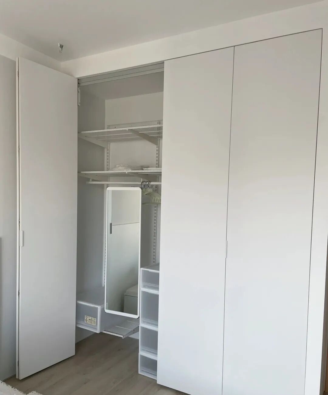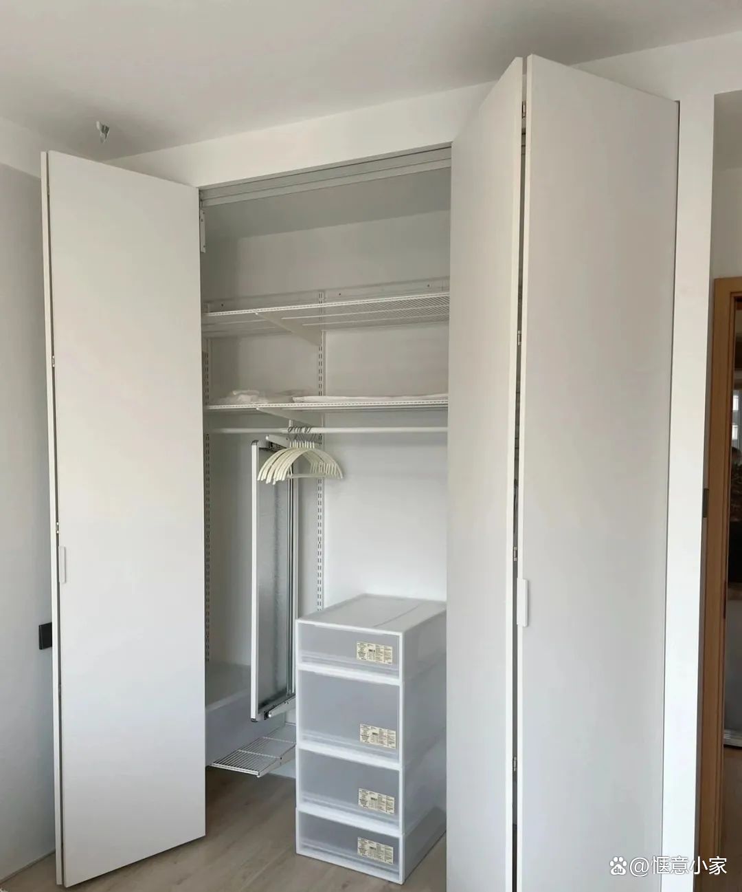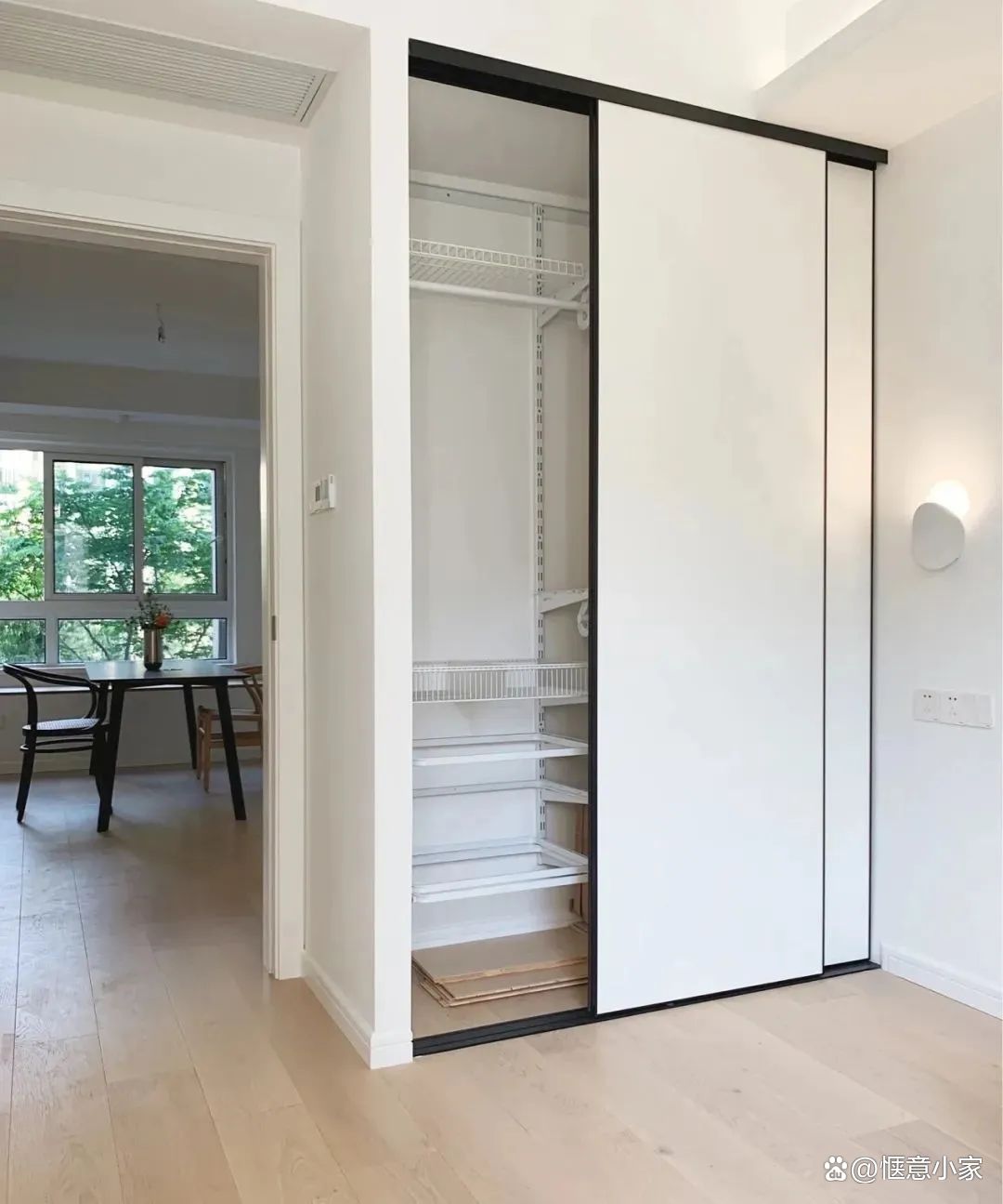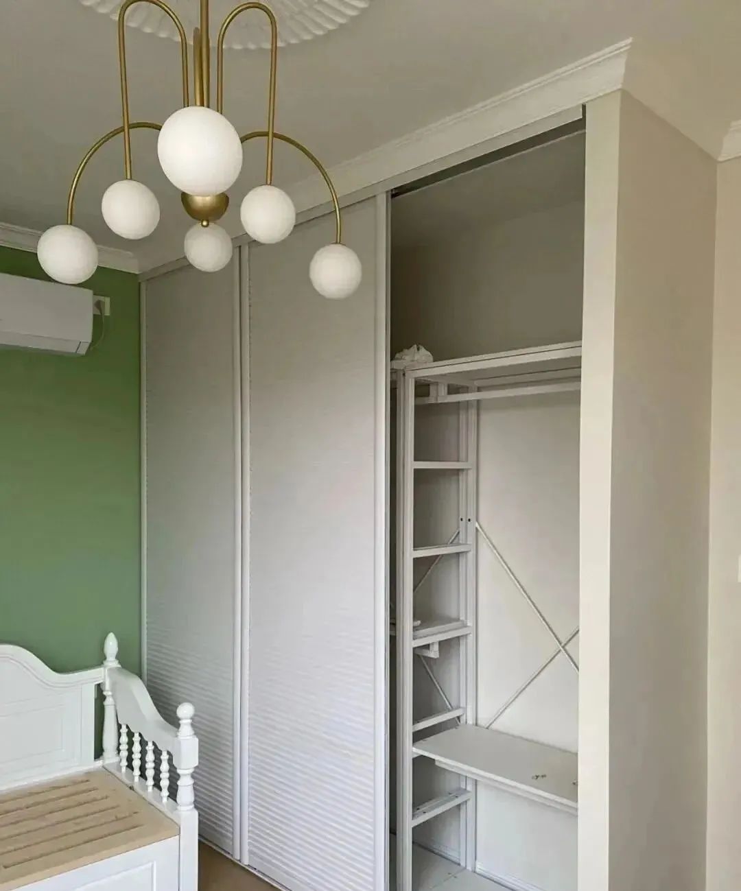 若准备装门,记得提前在顶部预埋轨道。衣柜门的形式有很多,像折叠门、推拉门、玻璃门、PVC门等等,结合经济实力来。