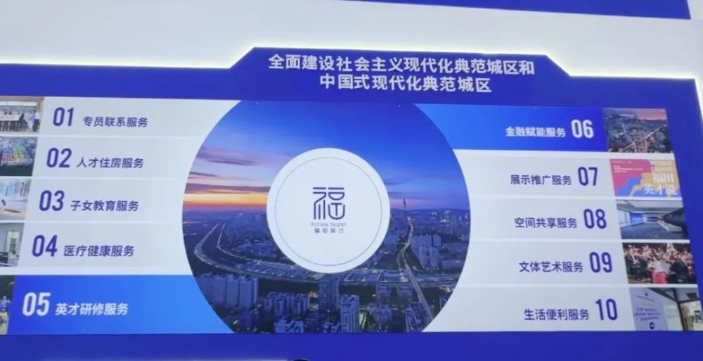现场集中展示了福田区独特的区位优势、产业布局、人才政策、人才风采;推出了福田英才10大服务清单,涵盖专员联系、人才住房、子女教育、医疗健康、英才研修、金融赋能、展示推广、文化艺术、生活便利等。
