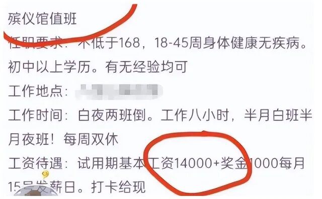 深圳殡仪馆招聘搬尸工,白班800元一天,夜班1600元一天,工资日结,不要求学历、工作经验,只有一个条件,身体无异常,胆子大就行。
