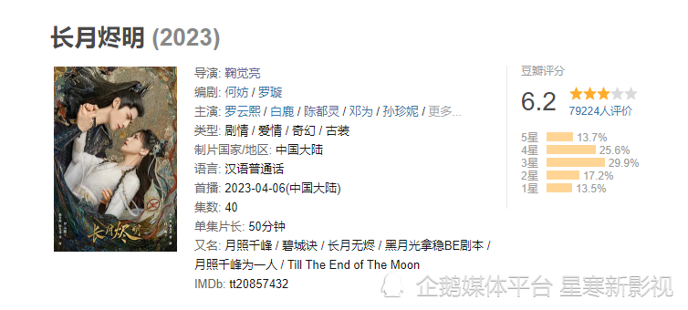 但比起热度方面的成绩,《长月烬明》在近期迎来的豆瓣开分,却是有些“两极分化”的意思,在近8万人参与评分的情况下,仅仅得到了6.2的评分,超过3成的人打出了2星及以下的分值,虽然在6.2已经属于及格的分数,在古偶剧中已经非常不错,但对于火爆全网的《长月烬明》来说,多少还是有点“寒碜”,特别是比此前的《星落凝成糖》的7.2分少了1.0分,更是让人有些意外!