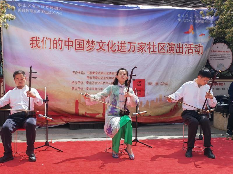 为更好地丰富和活跃社区居民的业余文化生活,满足居民群众的精神需求,更好的传承民族文化。4月19日上午,“我们的中国梦—文化进万家”文艺演出走进泰山区上高街道学苑社区,学苑社区盛世年华艺术走秀队与泰山民族乐团的艺术家们为社区居民送上了精彩纷呈的视觉盛宴。