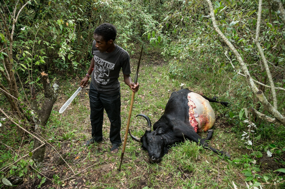 一位马赛牧民正在检查被狮子袭击的牛,这样的意外伤害很容易演变成对狮子的报复性毒杀