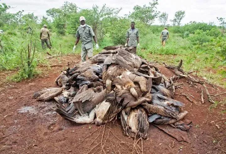 文章最开始提到的秃鹫中毒事发在南非克鲁格国家公园,现场调查中发现,一百多只秃鹫(和一头鬣狗)因为食用了一头被人为涂抹了毒药的水牛尸体而中毒身亡。