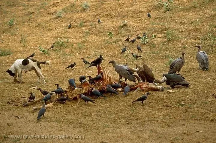 印度拉贾斯坦邦,秃鹫正在处理牛的尸体