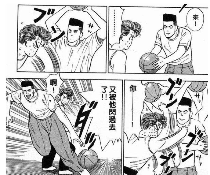 赤木拿到球,立刻发起了快攻,而樱木拼了命地往前跑。