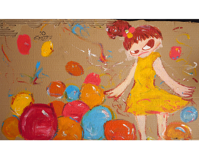 没有受过任何艺术专业训练的她,通过徒手蘸取丙烯颜料直接涂在画布或瓦楞纸上,在自学中形成了一套她独特的绘画方式和画风。
