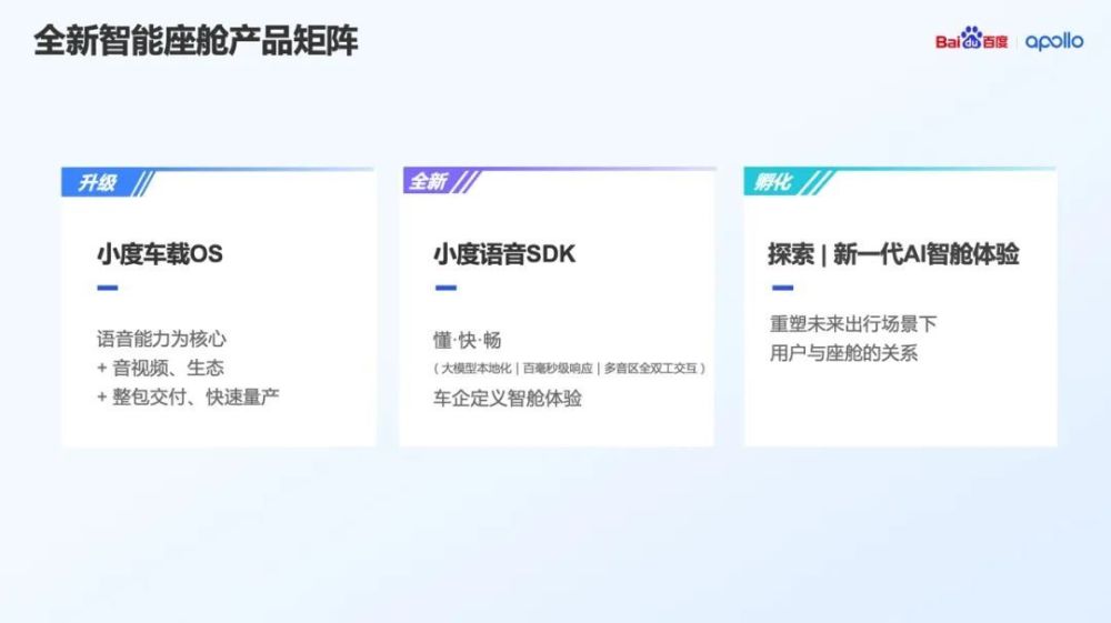 百度Apollo拥有小度车载OS、小度语音SDK,其中,小度车载OS作为整包方案,能快速搭载量产,小度语音SDK则基于大模型本地化部署,能实现全时全双工、百毫秒级响应,车企可以通过小度语音SDK定义并实现更好的智舱体验。