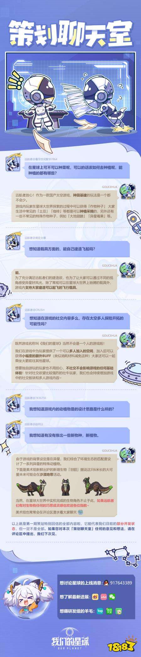 新一期研发小报出炉 太空种菜、建造飞船 大家对《我们的星球》的高期待,也激励着研发团队不断的对游戏内容进行着丰富和优化。在研发团队积极迭代优化产品的过程中,也持续收到玩家的热切询问,包括游戏玩法方面,游戏研发进度等等,都是玩家关注的焦点。为此,《我们的星球》特别增设了研发进度报告栏目,将会定期与玩家朋友们交流游戏最新的开发进度。在最新一期的研发小报中,就以问答的方式模拟策划聊天室,着重介绍了在星球上可以做哪些事。