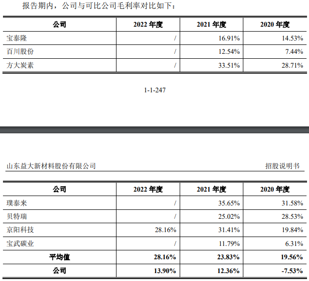 益大新材在招股书中表示,2021年,公司毛利率较上年增长19.89个百分点,主要原因系我国新能源汽车呈快速增长趋势,带动负极材料产量快速增长,进而导致负极焦价格增长;随着钢材价格回升,导致电极焦市场需求迅速增长;同时,下游客户陆续恢复正常生产,针状焦价格整体开始回升。可比公司中,方大炭素毛利率上涨4.80个百分点、璞泰来毛利率上涨4.07个百分点、贝特瑞境内业务毛利率上涨4.26个百分点。2021年,京阳科技毛利率较上年上涨11.57个百分点,与公司毛利率上涨趋势一致。