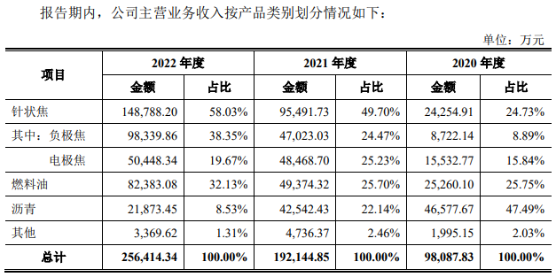 公司是一家集研发、生产、销售高品质针状焦为一体的现代化高新技术企业。公司针状焦产品为油系针状焦,包括负极焦、电极焦两种产品,总产能达19.50万吨/年。公司负极焦产品主要用于新能源电池负极材料的生产;公司电极焦产品主要用于制造电弧炉炼钢用大规格超高功率石墨电极本体或接头;公司生产的针状焦还可以用于生产高端特碳材料。此外,公司也有部分燃料油、沥青等联副产品的生产和销售。