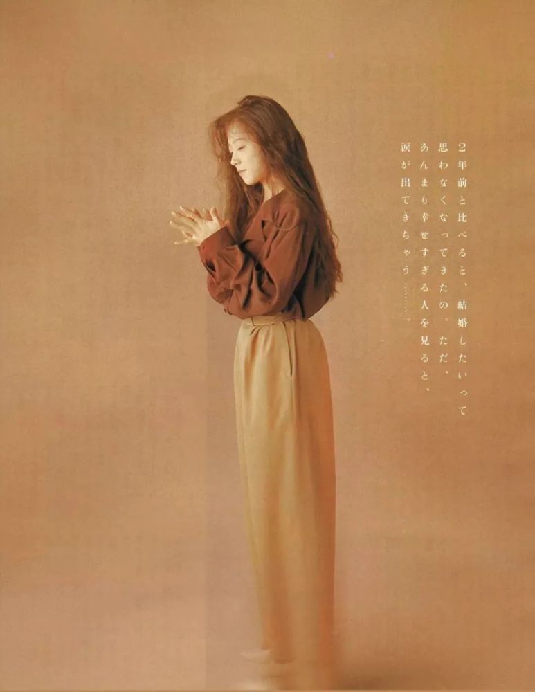 中森明菜的穿衣风格并不喜欢那些非常女性化的、复杂的单品,反而是有点中性化。Oversized 西服套装搭配女性化的真丝吊带等等,有着特殊的性感魅力。