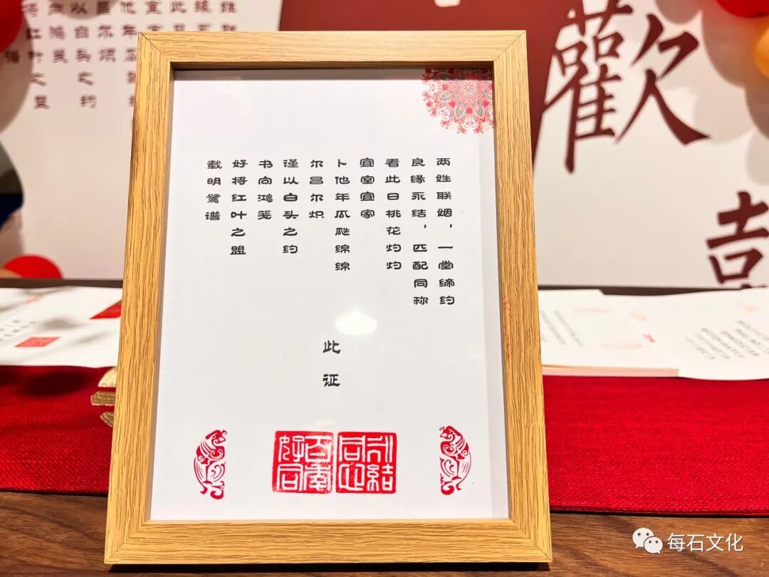 中国文化博大精深且历史悠久,石头本身也有“海枯石烂”的意义,印本身带有“印信”的含义,所以“印信”也表示承诺和责任。对章本身也象征着两人婚姻美满,能够相伴一生,白头偕老的信物,心心相应,盖下印章的那一刻,礼成。这些往昔古朴的婚书字句更适合流淌在夫妻心间......