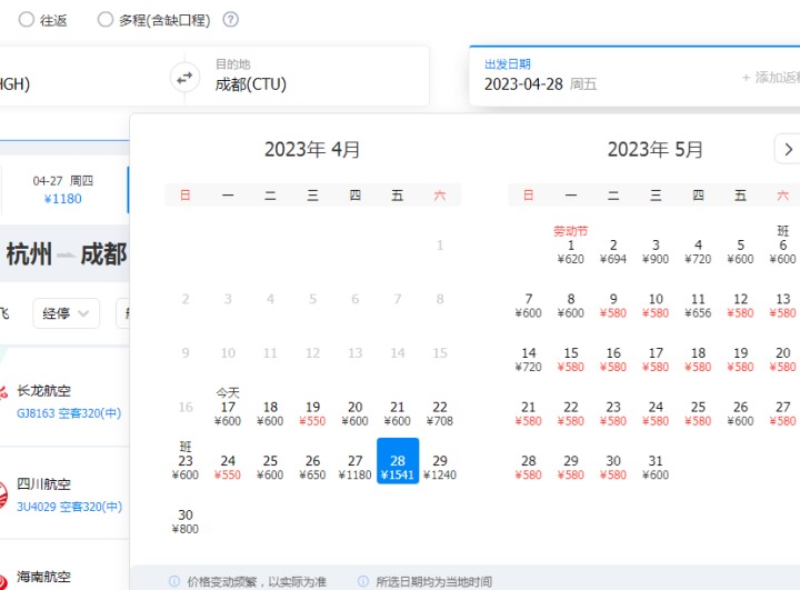 杭州飞成都,平时机票七八百元左右,如果“五一”小长假去,就要1500元。