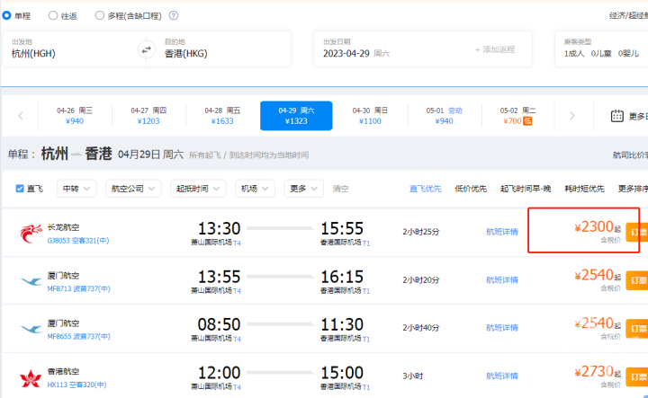 杭州飞香港,4月25日的机票约700元,而如果是4月29日假期首日出发,价格就飙到了2300元,“五一”假期后又回落到700元左右。