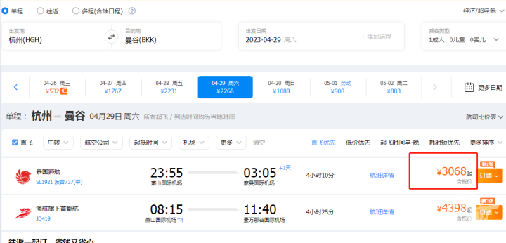 不仅跨省游热度高,出境游也很火热。比如杭州飞曼谷,4月25日的单程机票只要七八百元,如果4月28日、29日出发,机票就要3000-4000元,“五一”后又回落至1000元左右。
