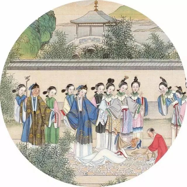 更让人唏嘘的是“林黛玉焚稿断痴情”和“薛宝钗出闺成大礼”两幅画一前一后对比,前者的哀怨孤清和后者热闹喧哗对比鲜明。