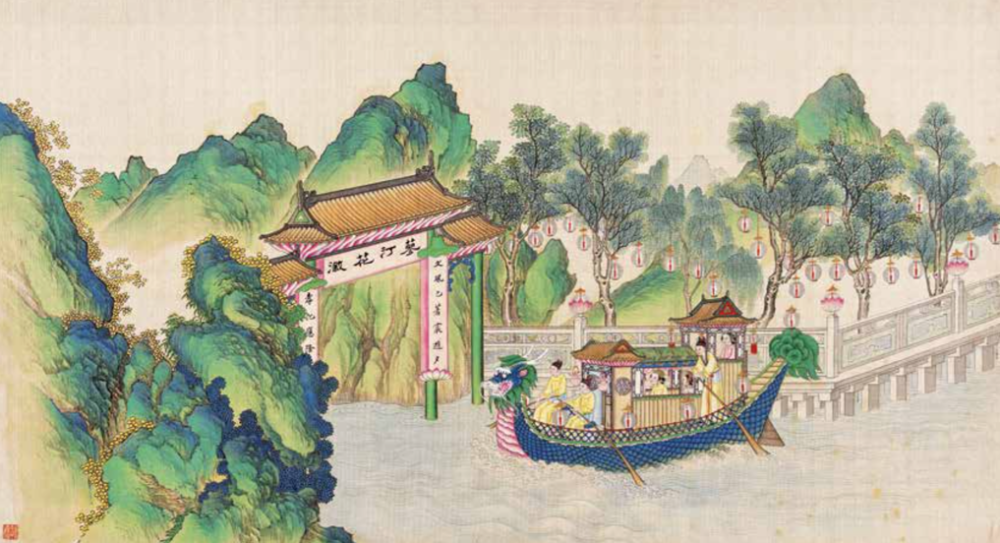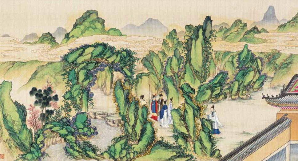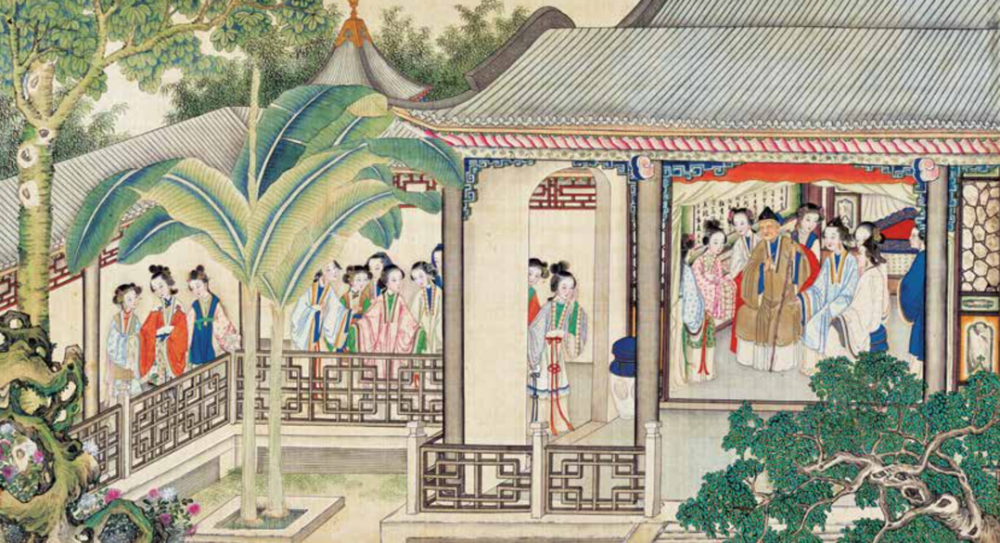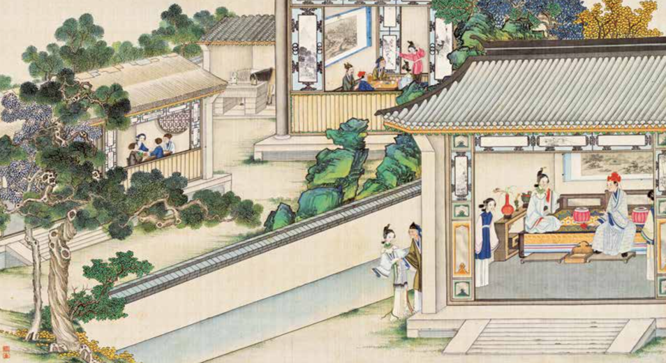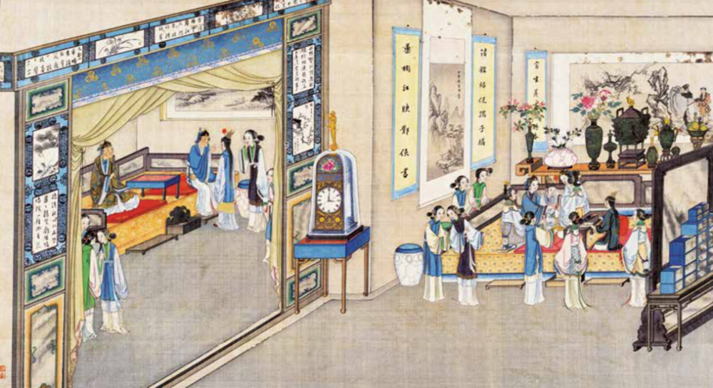 主要的人物的服装、佩饰,以及房内陈设古玩、雅件,都采用了“泥金勾染”技法,在一些花卉、地毯、甬道上,还添了厚粉,营造更立体逼真的视觉体验。