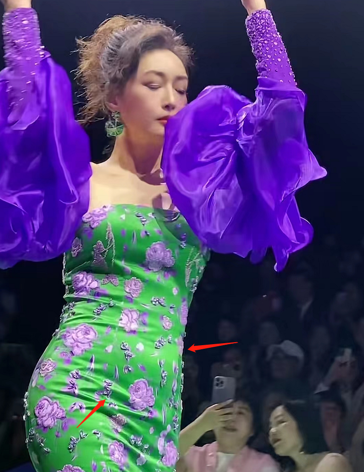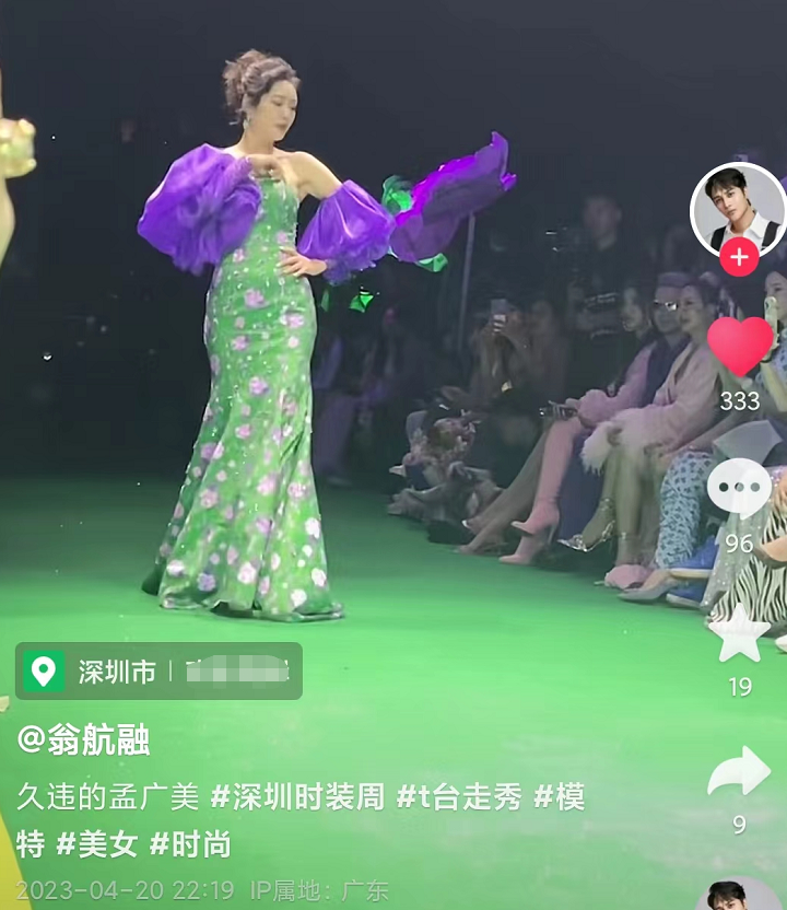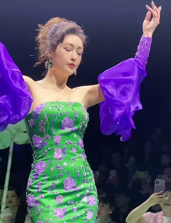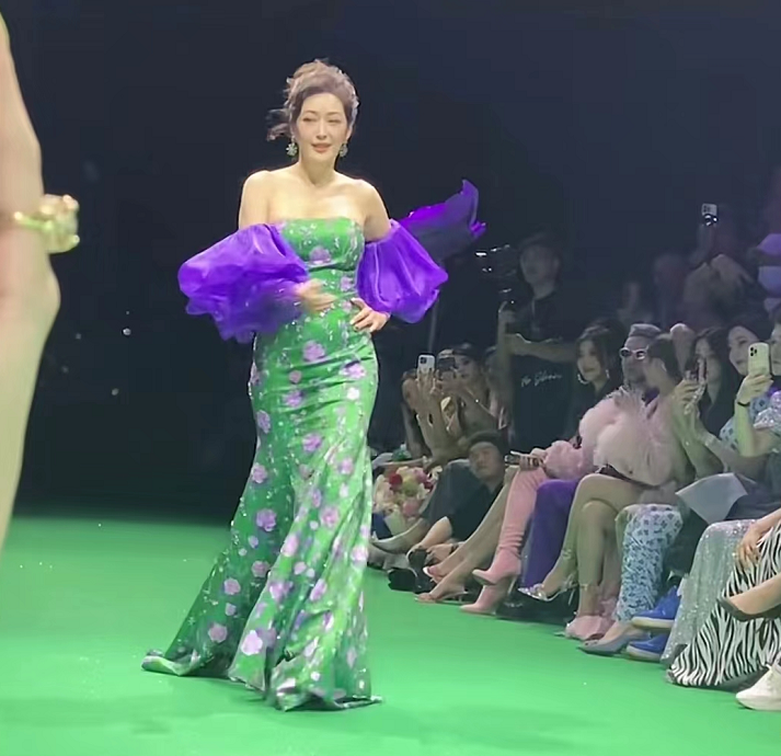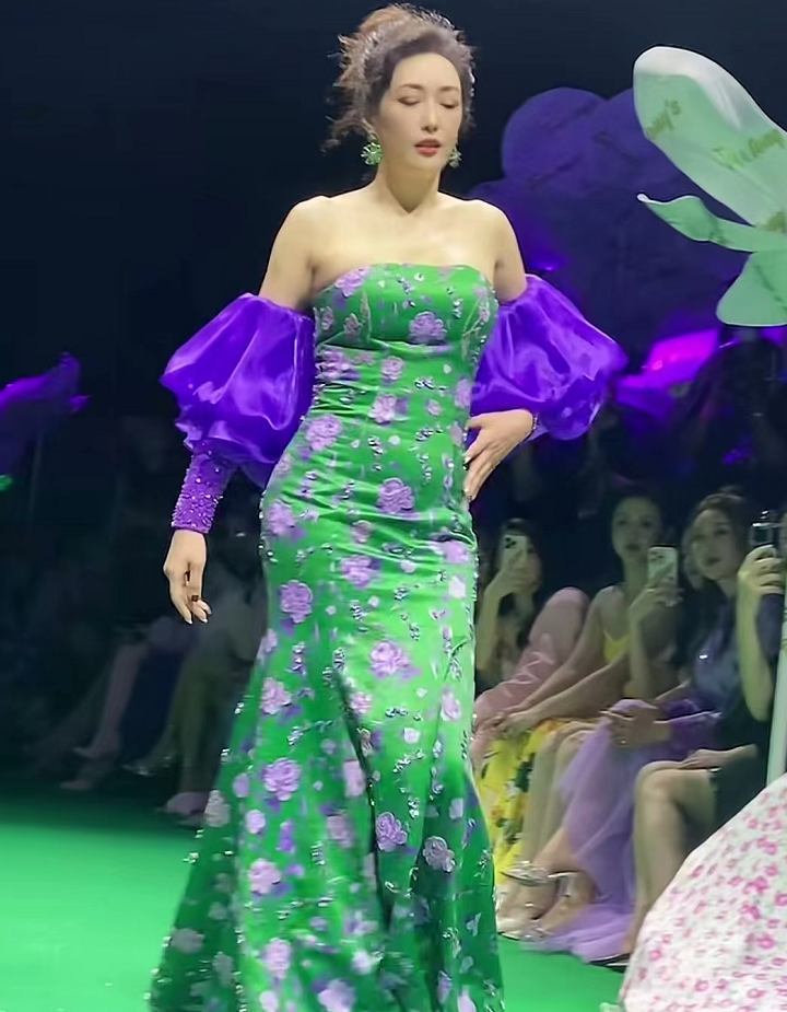 罕见露面的孟广美,穿着隆重的礼服现身深圳走秀。只见她身穿紧身绿色连衣裙,紫色泡泡袖设计非常特别,再配上精致的妆容和盘发,让她看起来既高贵又不失时髦。