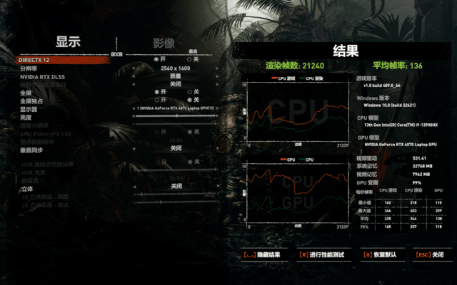第三款游戏是《古墓丽影:暗影》,分辨率为2.5K,选择系统预设的最高画质。最终运行Benchmark得到平均136帧的成绩,非常给力。这个成绩已经是入门电竞水平了,看来游戏本的电竞3A时代已经来了。