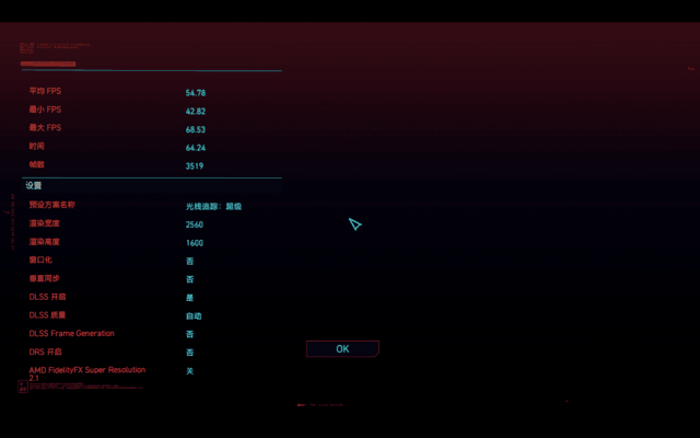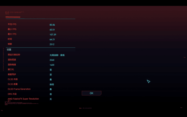 第一款游戏是硬件要求出了名的《赛博朋克2077》,我们直接将画质拉满,其中分辨率选择2.5K,画质使用预设的光线追踪:超级,这是该游戏的光追最高画质了,同时打开DLSS3。最终Benchmark得到平均80.86帧的成绩,流畅度没有问题,游戏体验有保障。在2.5K光追最高画质下得到这个成绩,还是非常给力的,放在一年前是不敢想象的。