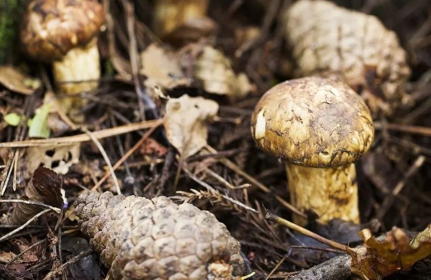秀儿发现不远的树底下鼓起了一个小包包,凭经验,她知道那里有东西,便立刻蹲在旁边挖起来。很快,一棵胖墩墩的松茸被启了出来。松茸是秦岭山地一种很珍贵的菌类,一棵新鲜松茸在市场里能卖到上百。秀儿把松茸拿给爷爷看,爷爷说:“唔,这棵菌长得秀,品相不错。”