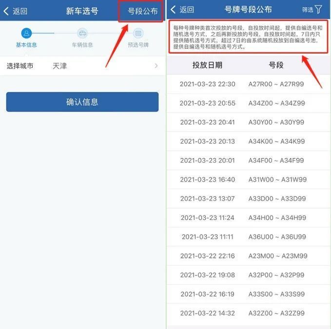 步骤二:进入选号确认页面,在右上角【号段公布】可以查看已投放的号段和投放规则。