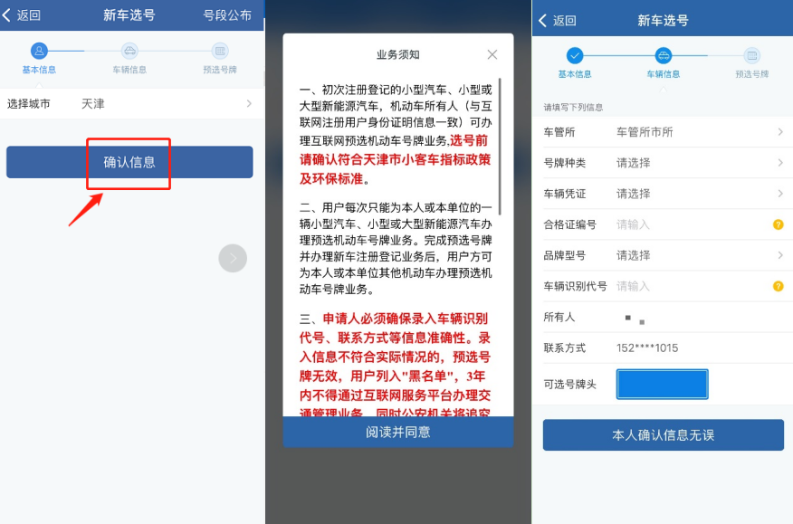 步骤三:查看号段后,返回确认信息页,点击【确认信息】,仔细阅读弹出的业务须知对话框,阅读后选择【阅读并同意】进入选号信息确认页面。