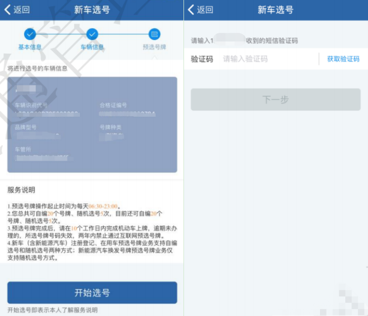 步骤五:填写后进入确认信息页面,点击【开始选号】,在进行手机验证码确认后,进入选号环节。