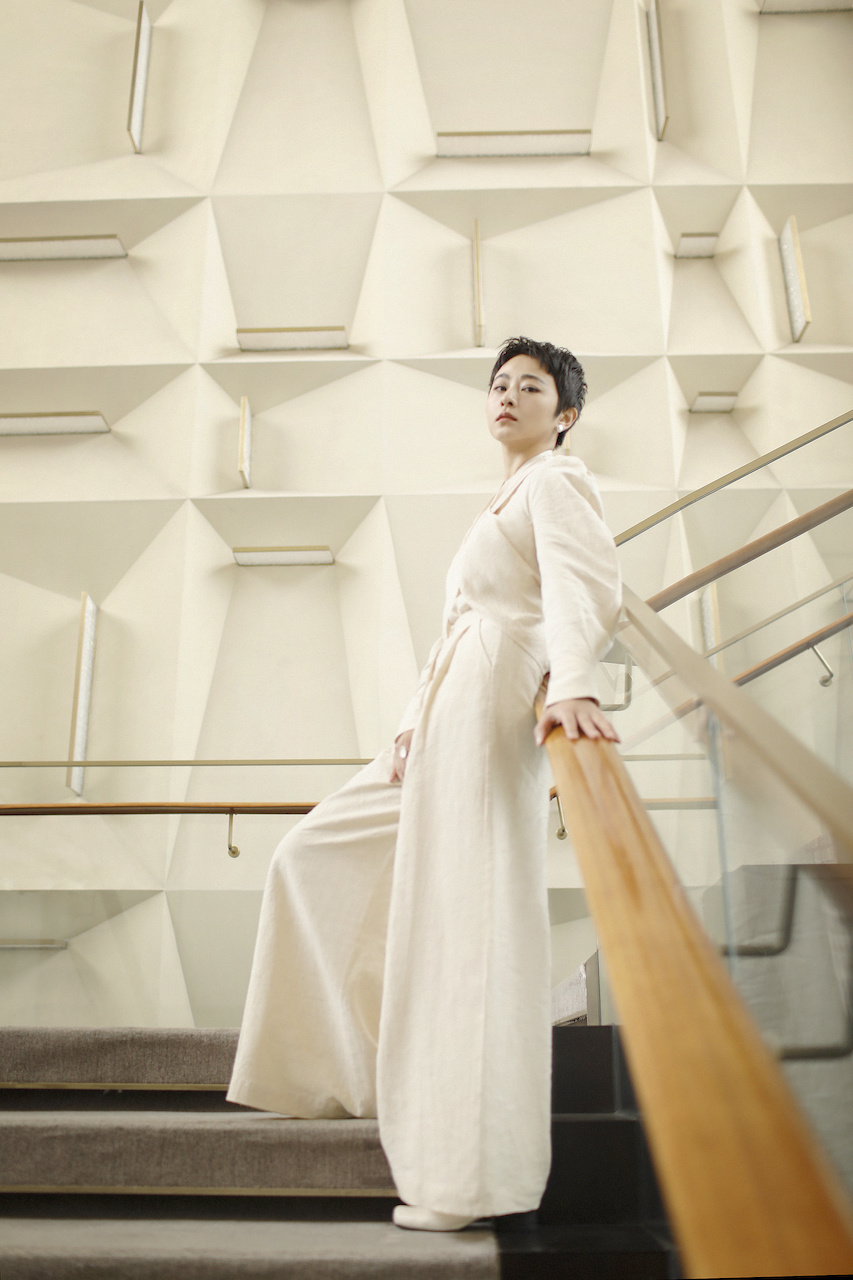 当晚的红毯活动上,南吉身着一套米白色天丝麻材质裤装,呈天然的肌理感,踏实朴素,舒适含蓄。经简单勾勒后大量留白,交叉捆绑式的前片设计,模拟部落女性以“布裹身”的原生态穿着方式,后背以一抹裸露,中和了裤装的中性感,将女性的身形之美,悄然藏于腰身与后背,流露于行走与转身之间。