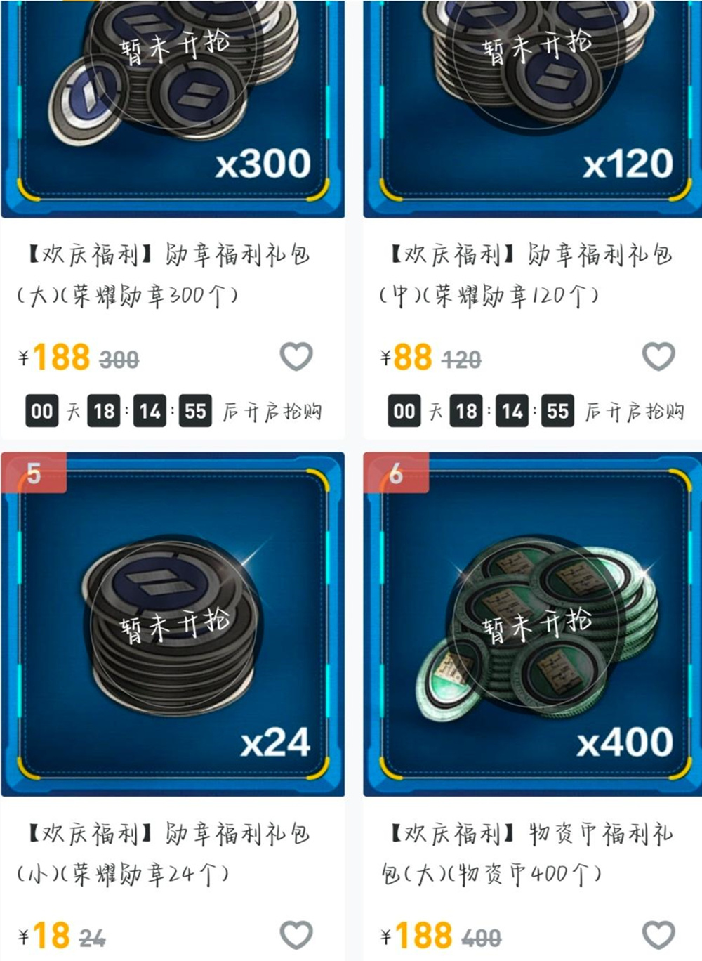 前文提到,此次“初夏福利礼包”一共有11个,荣耀勋章、物资币、服饰币的福利礼包共有9个,剩余2个均为“欢庆礼包”。
