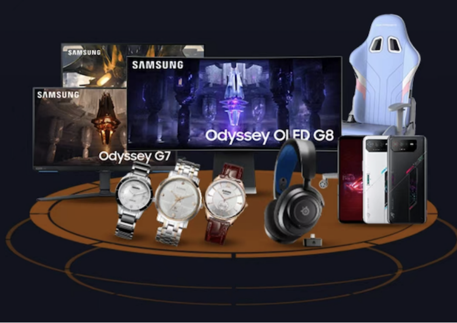电竞必备外设:ROG, 三星,七彩虹,华硕,赛睿,DXRacer迪瑞克斯的品牌周边以及手机、键盘,耳机、显示器、电竞椅等电竞设备。