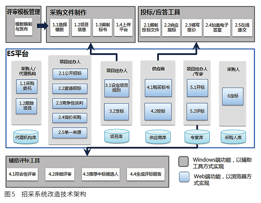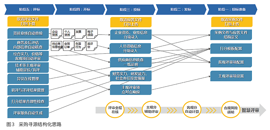 笔者梳理了当前采购寻源过程中仍需线下交互的系统断点,提出以评审要素结构化为目标,以评审环节线上化为切入点,反向规划设计供应商应答环节、采购文件编制环节的结构化需求,如图3所示,从而整体提升招标、投标、开标、评标、定标各环节的结构化水平,实现寻源全程在线。