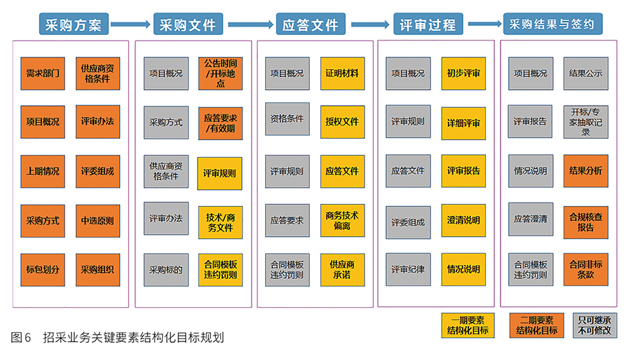 本阶段有两项核心工作:一是形成全流程标准化模板,包括招标代理委托、采购方案、采购文件、评审结果、采购结果等标准化模板;二是实现全流程数据贯通,关键要素节点一次录入、全流程共享,系统智能校验业务逻辑,出现问题时及时进行风险预警,减少人为失误,确保全流程各个环节准确、高效、合规。关键要素结构化目标规划如图6所示。