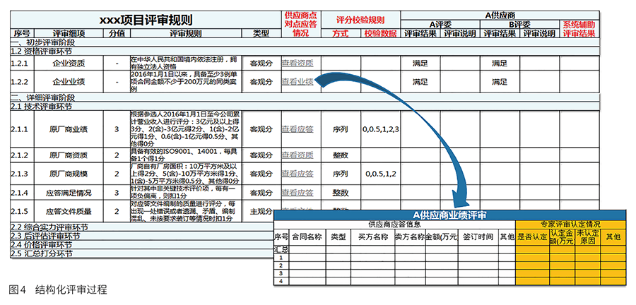 基于标准化的评审模板,招采系统将自动生成投标应答和评审步骤,并管控供应商逐项应答,专家逐项在线评审,如图4所示。同时,引入OCR等技术,实现企业资质、个人资质、业绩、发票自动验真,提高评审效率和规范性。