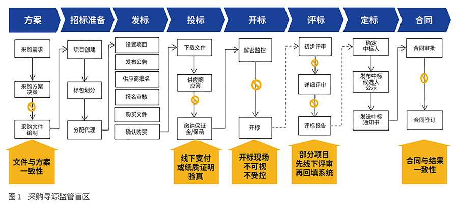 部分单位、部分项目的评审过程、合同编制等环节仍在线下操作、系统外循环,不可视且不受控,监管没有全覆盖。由于实际执行情况千差万别,很容易造成流程外风险,无法确保“实质合规”,如图1所示。