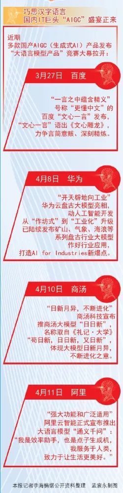反观我国,尽管未能抢占先机优势,但一众IT巨头密切跟踪并纷纷下场开发AIGC产品。阿里、华为、百度、商汤等科技企业近期相继发布各自生成式人工智能产品,“合体”向世界展示了中国科技实力。