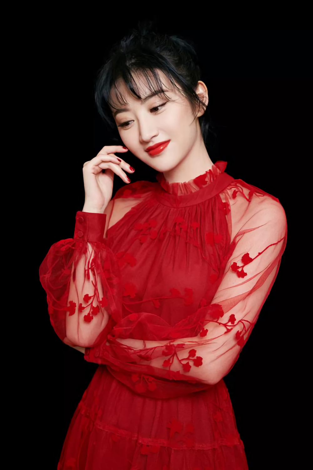 她,穿着一件艳丽的红色长裙,长长的黑发轻轻抚摸着肩膀,眉眼如画,唇若樱桃,仰起头来,一双清澈明亮的眸子里透着智慧、灵气和一种说不出的温柔。