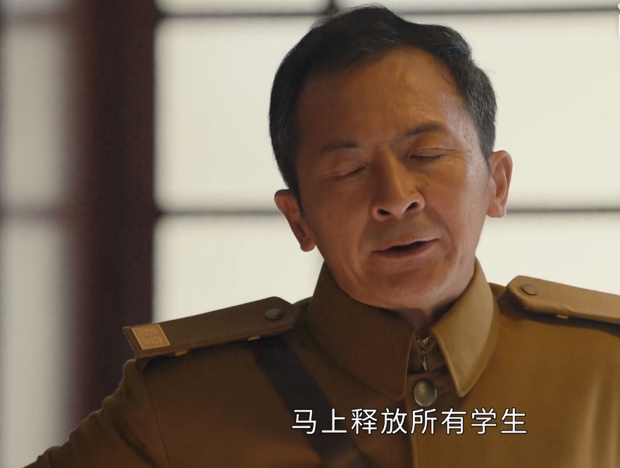 剧中他一出场,遇到的就是清华学子抗日请愿被捕的危机。