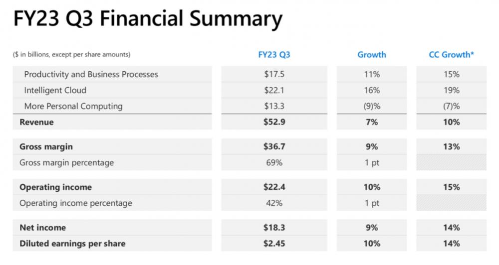 财报数据方面,微软Q3总共实现营收529亿美元,同比上升10%,高于分析师预期510.3亿美元;每股收益2.45美元,高于分析师预期的2.24美元。在主要业务方面,生产力和商业服务营收达到175亿美元,同比上升11%;智能云营收221亿美元,同比上升16%;个人电脑业务营收133亿美元,同比下降9%。