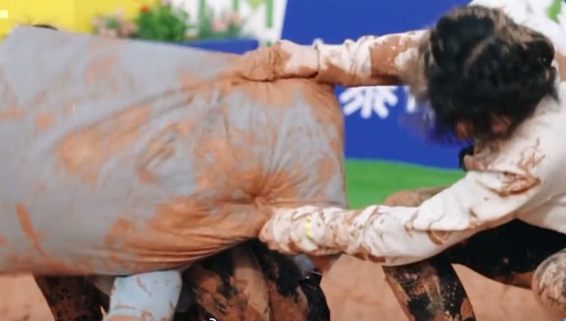baby被宋雨琦的枕头击中之后,泥浆四溅,其中一部分泥浆就溅到了宋雨琦的嘴里。随后,宋雨琦下意识地朝着baby的方向,把嘴里的泥浆吐了出去。电视播出这一段的效果时,就好像她在向baby吐口水。