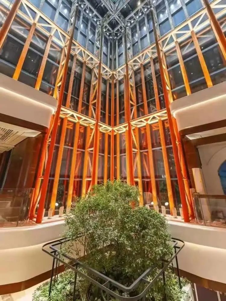 另一个与日出空间相呼应的日落空间藏在商场内部,需要我们搭乘电梯上楼,才能一睹其风采。日落霞光般的橙红色,洒落在玻璃上,映衬出商场内唯一的一棵的“空中之树”,绿意盎然,生机勃勃!