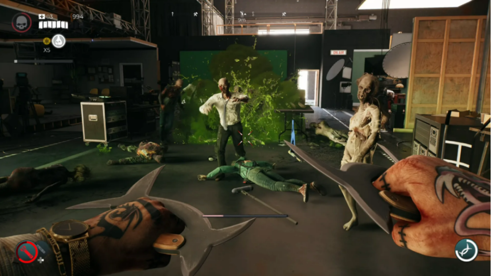好消息是,虽然本作在剧情方面有些欠缺,这场冒险本身至少还有一些非常搞笑的台词和给人很深印象的角色。而且这两点都在不经意间成为了《死亡岛 2》的优点。有一个角色让我去恐怖电影的布景中寻找他神经脆弱的助手,在这里会遇到一个喷吐酸液的巨大机器蜘蛛。另一个支线任务让我帮助网红博取更多关注,需要穷尽各种花样来击杀丧尸。开发者们用各种方式刀刀见血地讽刺大家对洛杉矶设定的刻板印象,让我想起了《GTA 5》中的洛圣都。