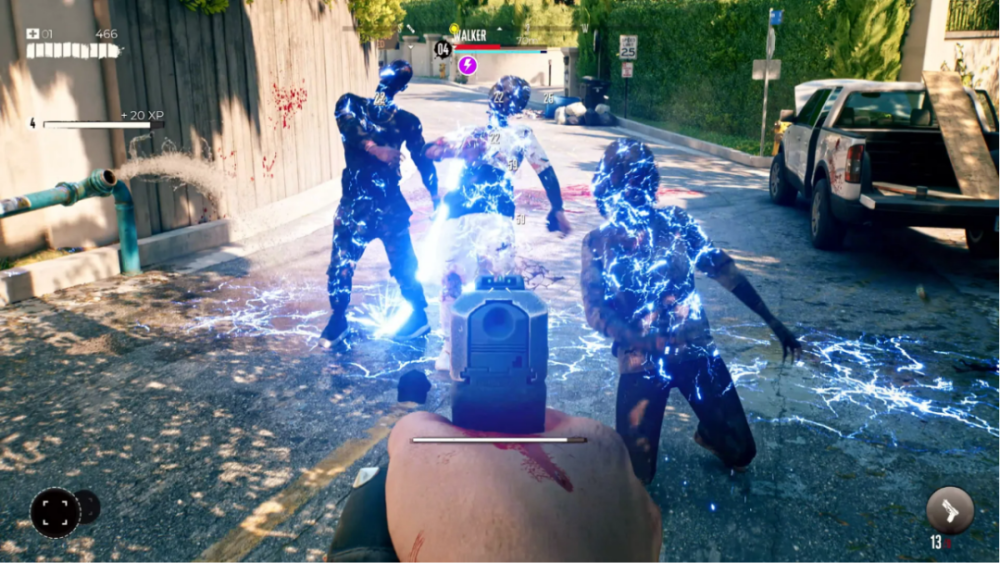 如果你曾经玩过任何一款丧尸游戏,那么你对本作设计更轻快的战斗模式必定不会陌生。你一开始使用棒球棍和锤子这样的近战武器,然后开始制作出一些更浮夸的破坏工具,比如带电的武士刀或者重击锤和火焰喷射器结合的魔鬼产物,最后也会用上枪械。