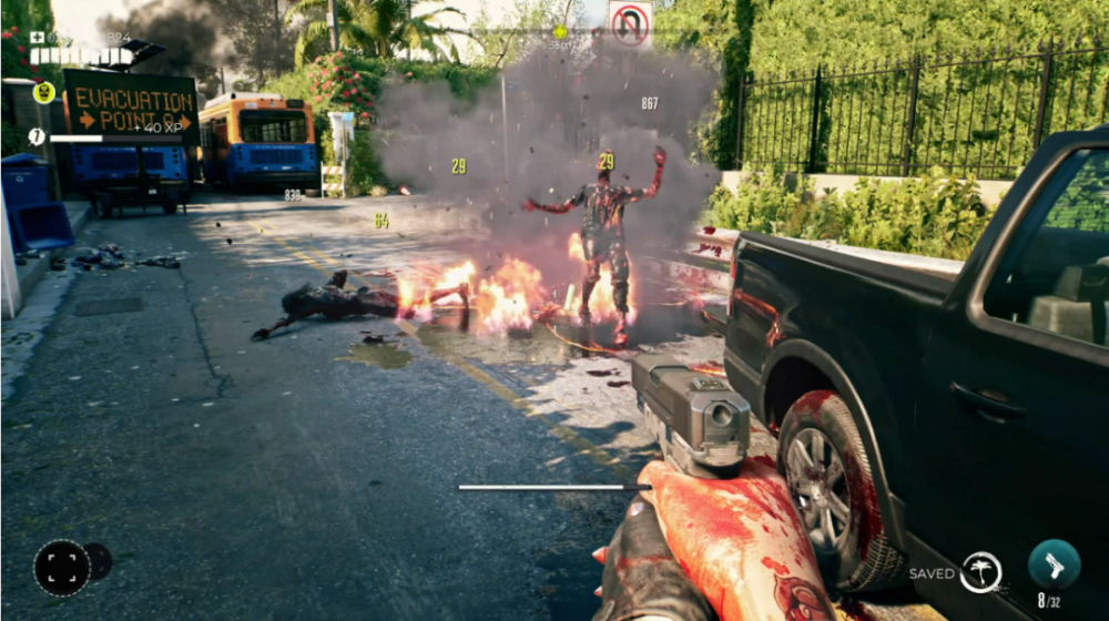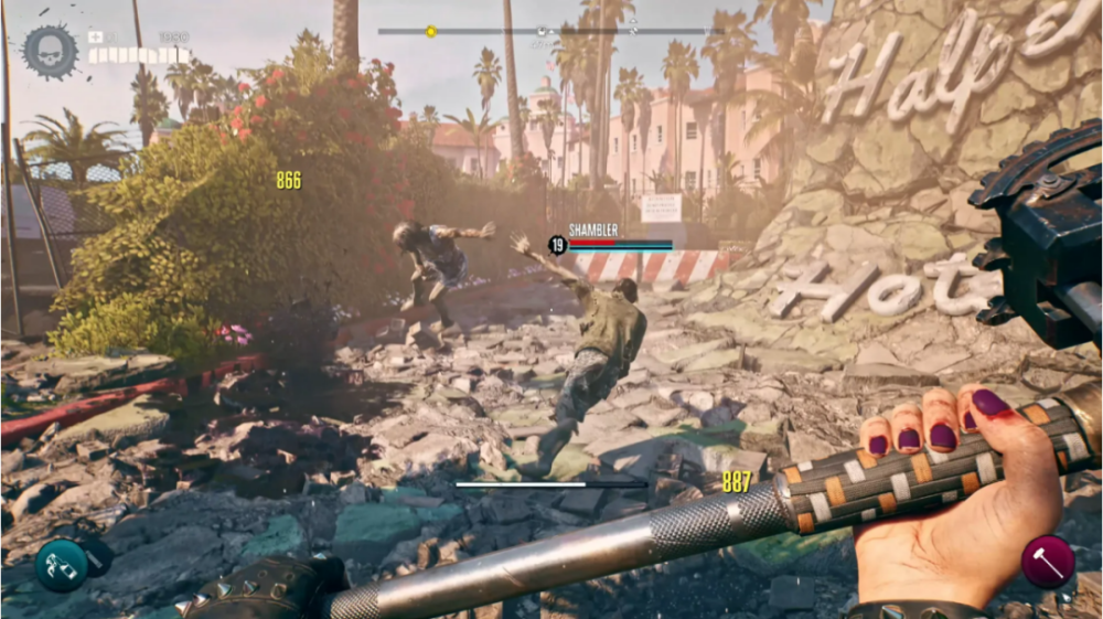 远程武器的加入只让战斗体验变得更糟,枪械质感不佳,打得不准,而且还吃不到绝大部分近战技能和增益。枪械就像是最后才想起来要加入这个沙盒中的附属产物,完全没有优化过。游戏中的枪械不仅没法有效对付丧尸,而且弹药非常稀少,射击手感还很差。除此之外,从四面八方涌过来的丧尸意味着,你朝着一个目标开两枪就会被其他扑过来的丧尸 QTE 打断,强迫你用回近战。再者,对比起我去年在《消逝的光芒 2》的维勒多中的跑酷时光,《死亡岛 2》的战斗机动性只能说是腿脚僵硬。