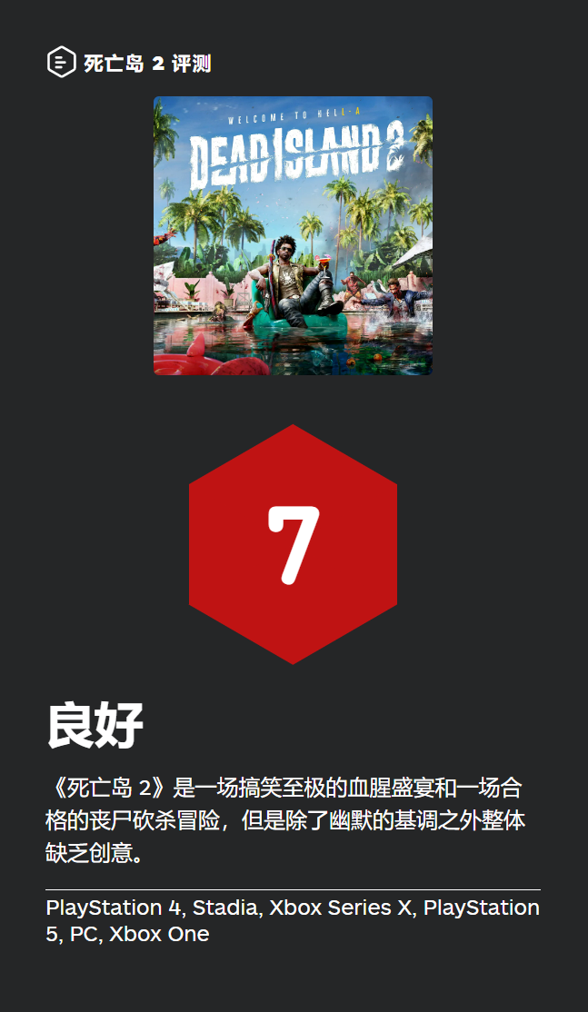 自原版《死亡岛》在十多年前诞生以来,大量其他丧尸游戏已经做到了更好,特别是《消逝的光芒》和《消逝的光芒 2》(这两作都是由《死亡岛》的开发商 Techland 制作的)。不过即便本作缺少原创性,《死亡岛 2》依然很好地带来了一款设定在洛杉矶的夸张至极的丧尸喜剧,并且为这个萎靡不振已久的系列注入了一剂现代化美容针。利用游戏中的血腥系统让好莱坞的红毯染得更红,这个过程非常欢乐,没有白费游戏时光。