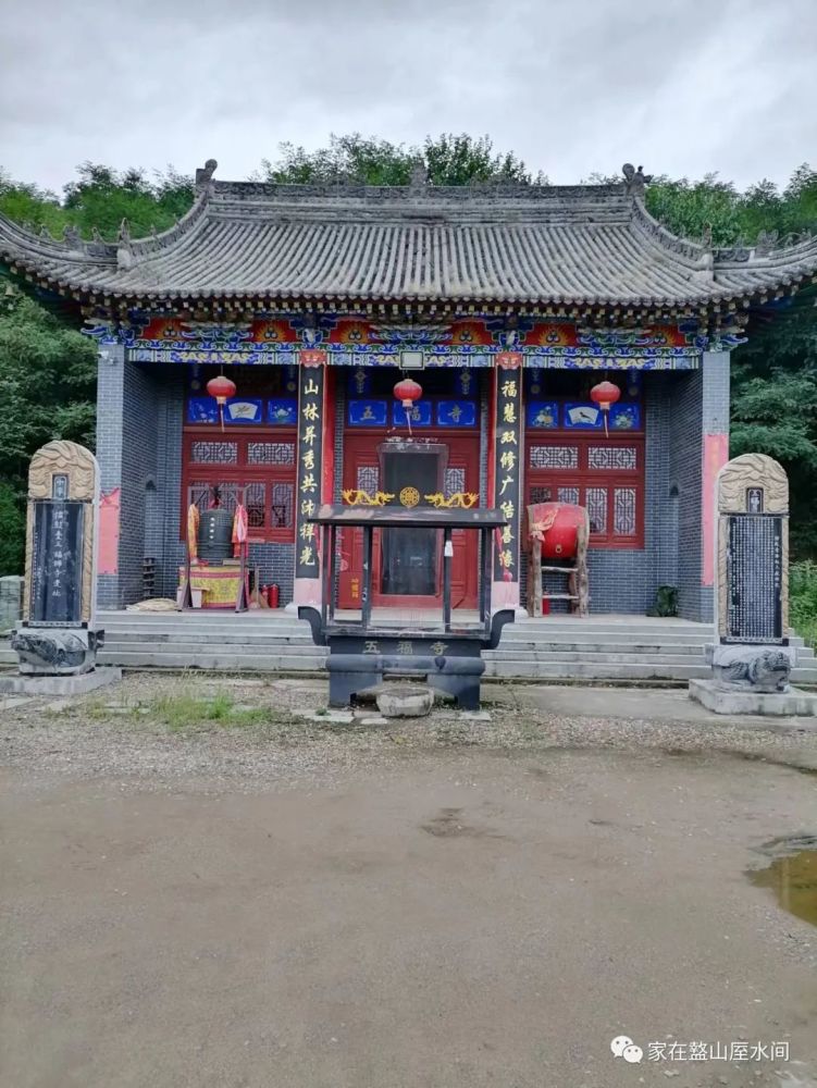 擂鼓台东南一条梁与秦岭相连,山腰有一寺,名叫“五福寺”,坐南向北,面阔三间,背依南山,百亩森林拱卫,面朝渭水,条条沟道朝拜。东临槐树沟眼眺晏家梁,西连泥峪口远望十字山,“福慧双修广结善缘,山林并绣共沐祥光。”禅音袅袅,香火缕缕,花木广布,珍禽咸集,环境优美。漫步寺西阔路,有一片绿茵茵的菜地,忽传妙妙禅音,原来是菜地里藏有音箱,连蔬菜和周边花草树木都受到佛音的感化。登寺眺望,满沟文化半沟福音,垂首凝视,风光旎旎,胜景无限,是礼佛参禅悟道修身的好去处。