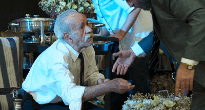 在五个女孩的簇拥中,老人开心地和长子抱在一起…
