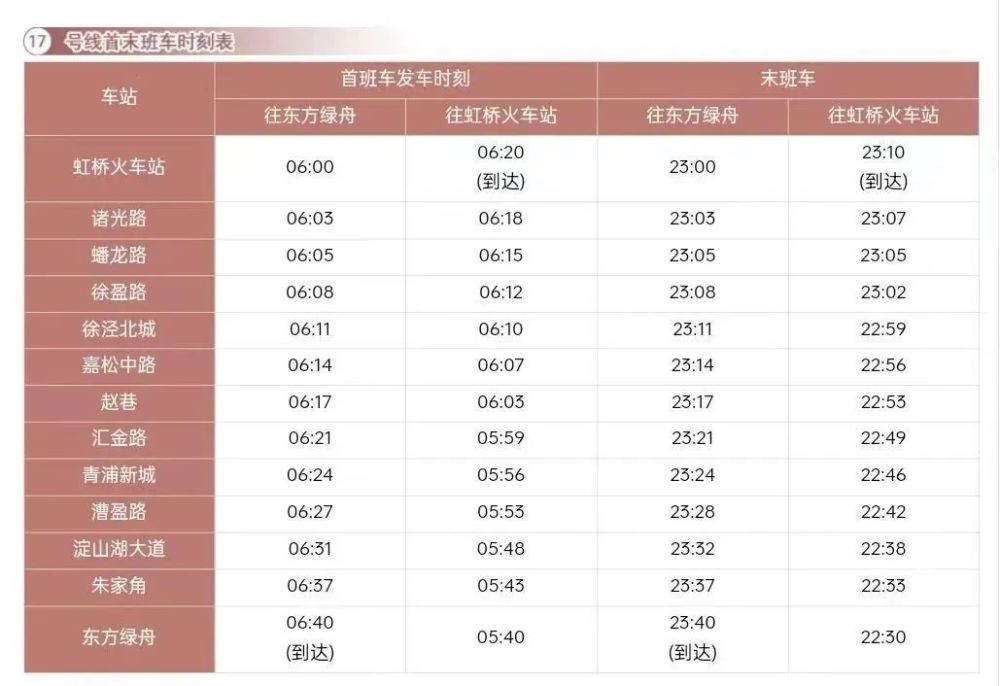 4月28日起,上海这6条地铁线实施周五、周六延时运营。旅客可选择乘坐地铁2、10、17号线抵达虹桥火车站前往目的地,三条地铁线路的首末班车时刻表及虹桥火车站出门口,见下图。(